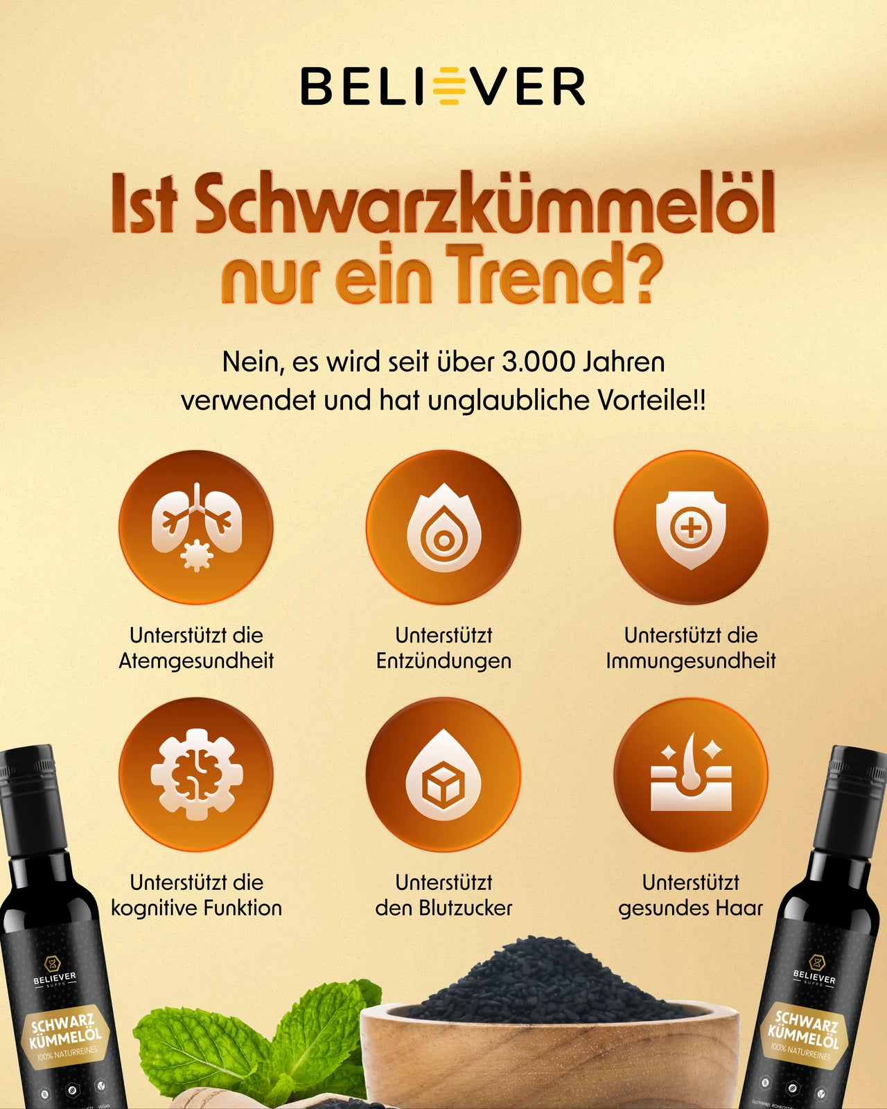 Unser Schwarzkümmelöl überzeugt durch seinen außergewöhnlich hohen Thymochinon-Gehalt, die schonende Herstellung und 100 % naturbelassene Qualität. Ob zur täglichen Einnahme, für Haut und Haare oder als Begleiter in der Küche – es ist ein echtes Kraftpaket für deine Gesundheit.